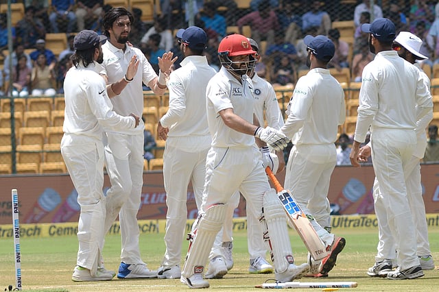 Indian cricketer Ishant Sharma with teammates celebrates the wicket of Afghanistan batsman Afsar Zazai during the second day of a one-off test match at M Chinnaswamy Stadium in Bengaluru on Friday. ( EPS | Vinodkumar T )