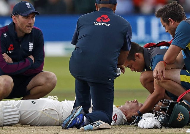 The star batsman fell face forward onto the ground and received several minutes of on-field treatment involving both Australian and England medical staffs amid concerns he could be concussed.