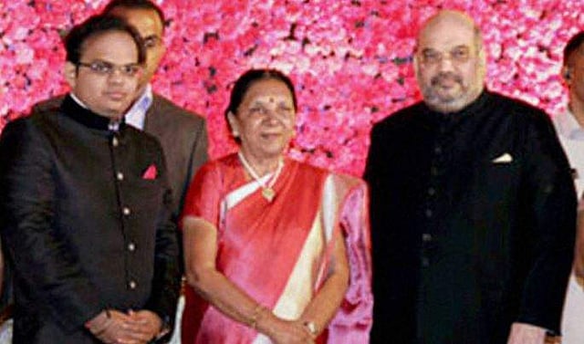 Jay Shah, left, with Ex-Gujarat Chief Minister Anandiben Patel, centre and Amit Shah, right. (File | PTI)