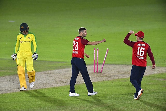 Australia was handed a brilliant start to the chase as captain Aaron Finch (46) and David Warner (58) shared a 98-run opening stand. Things started going downhill, though, after the loss of Steven Smith for 18 to make it 124-2 and Glenn Maxwell four balls later for 1, both falling to the spin of Adil Rashid.