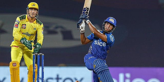 NAVI MUMBAI: Chennai Super Kings pacer Mukesh Choudhary wreaked havoc with the new ball before Tilak Varma's responsible half-century lifted Mumbai Indians to 155 for seven in the IPL here on Thursday. Invited to bat, Choudhary (3/19) accounted for Rohit Sharma (0) and Ishan Kishan (0) in the first over and then dismissed Dewald Brewis (4), leaving Mumbai reeling at 23/3.