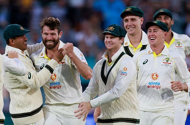 Australia's Michael Neser, second left, celebrates with teammates on the second day of their cricket test match in Adelaide. (Photo | PTI)