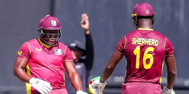 The West Indies didn't look like reaching 200 at 143-7 in the 40th, but Odean Smith immediately hit two sixes over McBrine's head, hit two more against Campher, and swatted Mark Adair over the long off fence. Smith made 46 off 19 balls in a partnership of 58 with Romario Shepherd to get West Indies over 200.