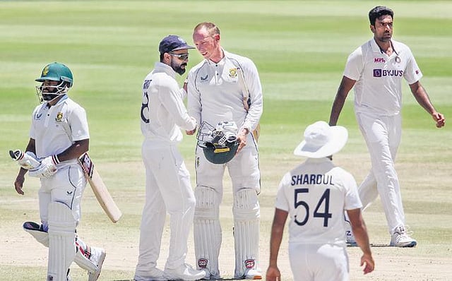 India 1st innings: 223; South Africa 1st innings: 210; India 2nd innings: 198 lost to South Africa 2nd innings 212/3 in 63.3 ovs: Markram c Rahul b Shami 16, Elgar c Pant b Bumrah 30, Petersen b Thakur 82, Dussen 41 n.o, Bavuma 32 n.o. Extras: (lb8, nb3) 11; FoW: 23/1, 101/2, 155/3; Bowling: Bumrah 17-5-54-1, Shami 15-3-41-1, Yadav 9-0-36-0, Thakur 11-3-22-1, Ashwin 11.3-1-51-0.