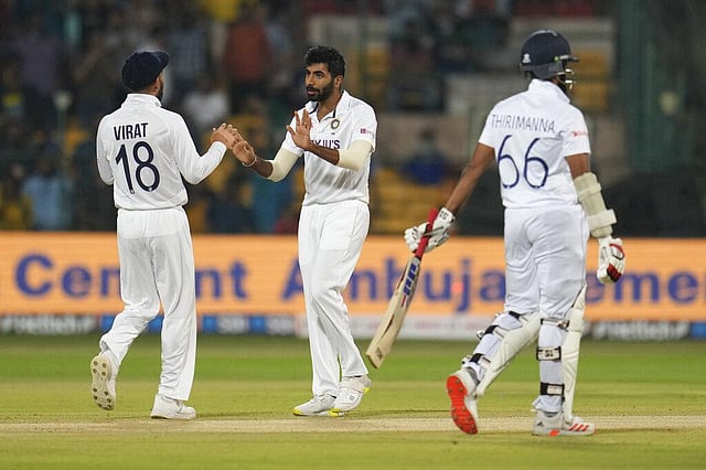 SRI LANKA 1st Innings (O/N 86/6): Dickwella c Pant, b Bumrah 21, Embuldeniya c Pant b Bumrah 1, Lakmal b Ashwin 5, Jayawickrama (not out) 1, Fernando st Pant, b Ashwin 8. Extras (b 1) 1. Total (35.5 ovs, all out) 109. FOW: 95/7, 100/8, 100/9. Bowling: Bumrah 10-4-24-5, Ashwin 8.5-1-30-2, Shami 6-1-18-2, Jadeja 6-1-15-0, Axar 5-1-21-1.
