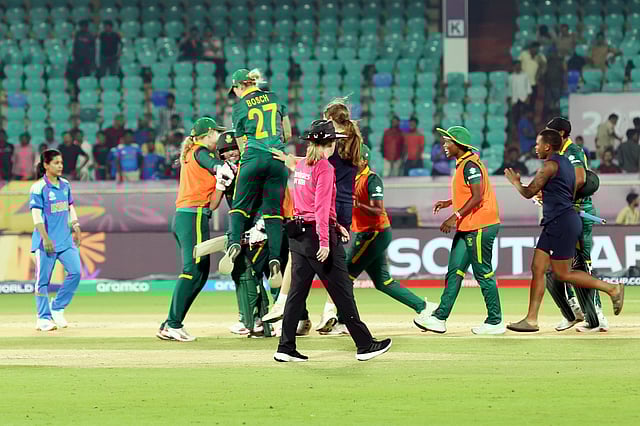 And she did just that, playing out Rana before collecting a boundary off Amanjot Kaur. She put the foot down against Rana, smashing a six and a four in the 46th over. Tryon fell for 49 from 66, but De Klerk took the chase deep. She stood in the crease and let Gaud's bouncer go. It was called wide before De Klerk sent the pacer into the stands over deep midwicket. She held her bat up for her fifty, pumped her chest and gestured to Ayabonga Khaka at the other end. A six and a four followed, India felt the pressure. Richa Ghosh called for the physio and South Africa were not pleased. That, however, did not put any brakes on De Klerk who farmed the strike, launched Deepti behind square and over covers. Two more sixes against Amanjot and the chase was sealed. She let out a roar and punched the air in delight — an unbeaten 54-ball 84 taking South Africa home against India.