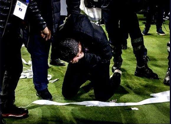 The incident prompted the Olympiakos team to leave the pitch in protest before riots erupted outside the ground.