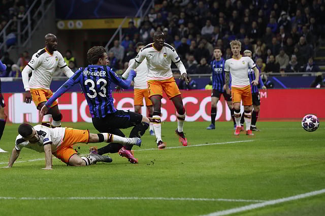 Atalanta's Hans Hateboer (33) scores his side's opening goal during the Champions League round of 16, first leg match against Valencia. (Photo | AP)