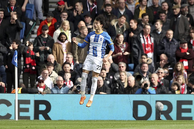 Brighton and Hove Albion's Kaoru Mitoma celebrates scoring his side's first goal during the English Premier League.(Photo |AP)