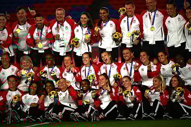 In this file photo taken on August 6, 2021, Canada's women's football team and staff members pose with their Gold Medals during the victory ceremony after the Tokyo 2020 Olympic Games. (Photo | AFP)