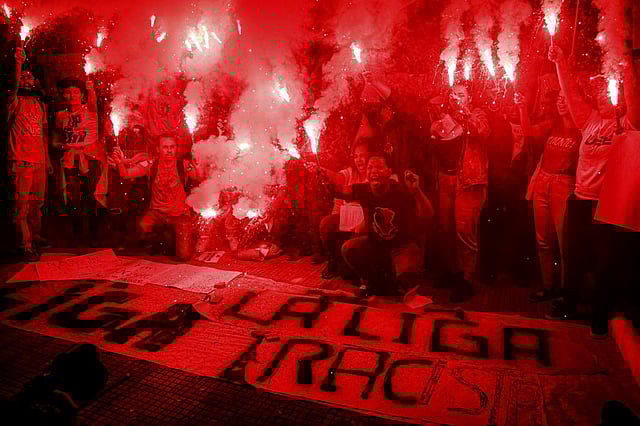 The protesters chanted “La Liga is racist” and “end with racism in Spain and in Brazil” for about an hour. They brought flares, banners and stickers that read “Vini Jr, I am with you.” They projected the words “it is not soccer, it is racism” onto the walls of the consulate.