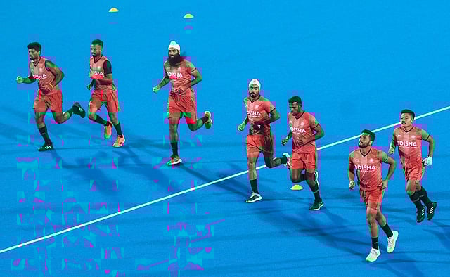 Indian hockey players during a practice session at the Kalinga Hockey Stadium in Bhubaneswar, Wednesday, Jan. 18, 2023. (Photo | PTI)