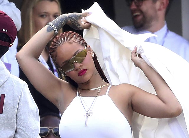 Dressed in white and wearing sunglasses, the Barbados-born singer gave vocal support to the two-time champions, who have flopped badly at the World Cup, winning just one match so far.
