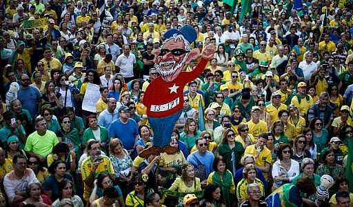 Marchers carried an enormous banner that read "Dilma out and prison for Lula," a reference to former president Luiz Inacio Lula da Silva, who was charged Friday with obstruction of justice in an ongoing corruption probe.
