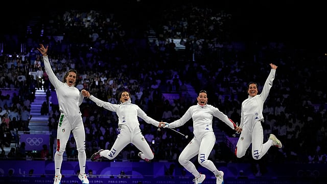 Alberta Santuccio got the winning touch for Italy in overtime against France's Auriane Mallo-Breton to complete a hard-fought 30-29 win for gold. It was the second time that Mallo-Breton lost a Paris Olympic final by a single point after a 13-12 loss to Hong Kong's Vivian Kong Man Wai in the individual epee Saturday.