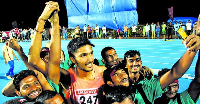 Tejaswin Shankar taking a selfie with ground staff after his win. | P Ravidra Babu