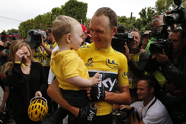Froome's teammates wore a yellow stripe on the back of their Team Sky shirts. They allowed themselves a flute of champagne, chinking glasses with leader Froome, as they casually rolled through the streets under cloudy skies beside cheering fans packing the roads into Paris.