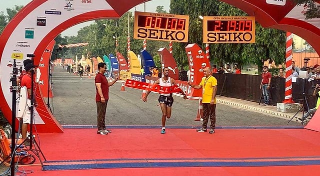 Ethiopia's Belihu clocked a provisional timing of 59.10 to defend his title at the Jawaharlal Nehru stadium, while Gemechu broke her event record with an impressive 66:00.