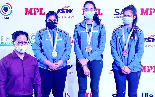 NEW DELHI: India women's 25m pistol team comprising of Manu Bhaker, Rahi Sarnobat, and Chinki Yadav on Thursday won a gold medal in the ongoing ISSF Shooting World Cup. The Indian team defeated Poland 17-7 in the final to win the gold medal.