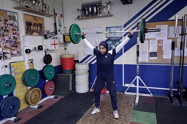 MANTES-LA-JOLIE: On the outskirts of Paris, 44-year-old French Muslim weightlifter Sylvie Eberena concentrates hard and pushes 80 kilos of bar and weights clean over her veiled head.