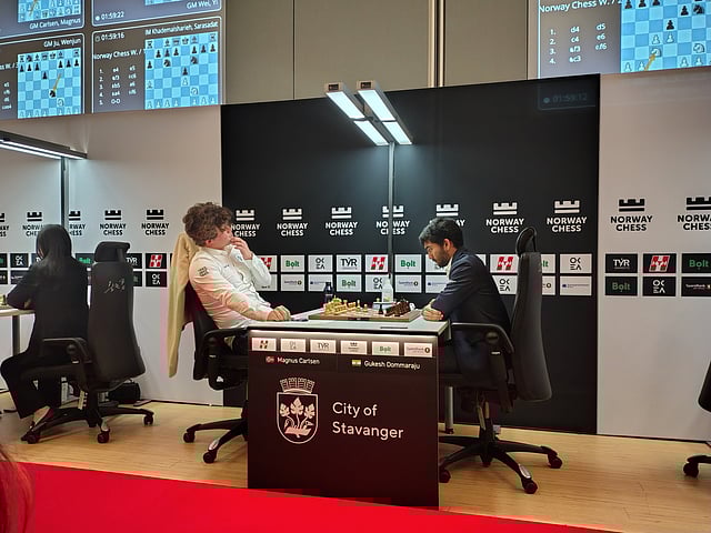 Gukesh, as he is known to do, entered the playing hall -- situated inside a big bank just off downtown -- roughly 10 minutes before the game. Carlsen? The organisers had to circle back to his board for the ceremonial first move as the Norwegian World No. 1 was late by a few minutes. Just Carlsen things.