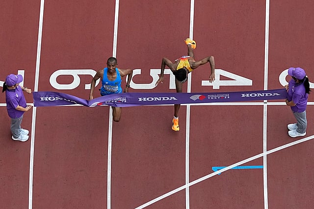 Simbu's win outdid that. It was the closest marathon in world championships history. Both men were officially clocked at 2 hours, 9 minutes, 48 seconds, with the photo showing Simbu lunging across the line a fraction sooner.