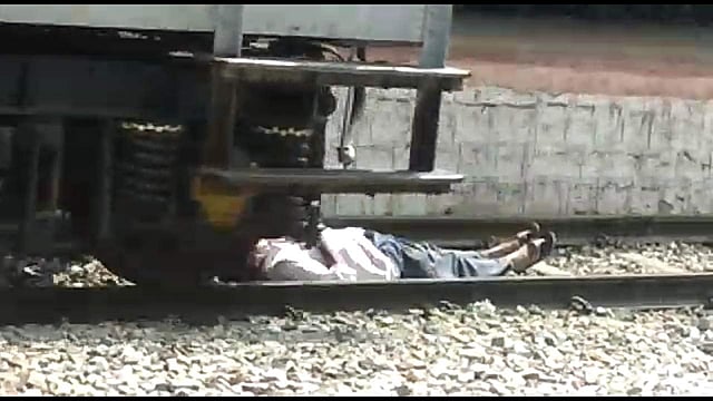 Caught in a fix, the person lied down on the tracks and stayed still as the train accelerated past the station.