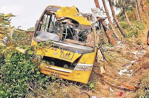 The police are suspecting that the driver might have fallen asleep at the wheel. Srinivasa Rao was working as a teacher at Ramakrishna School. He engaged a school bus for his daughter’s wedding at Bapatla.