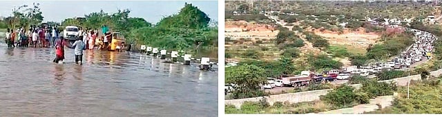 The main road of Taduvai of Achempeta Mandal got inundated due to the discharge of water from Pulichinatala project. The locals said that more than three feet of water was there on the roads and vehicle movement stopped between Madipadu-Achepeta on Thursday. More than 21 villages of tail-end areas got water logged following discharge of water from Prakasam Barrage and 650 hectors of cotton fields were inundate in these areas.