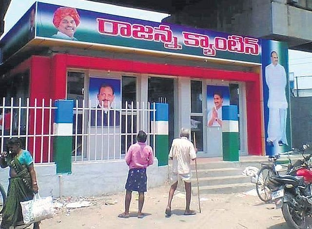 GUNTUR: One of the three Anna Canteens in Narasaraopet town of Guntur district now holds a banner with Rajanna Canteen printed on it. The building that houses the facility has been decorated with the YSRC flags and life-size cutouts of former Chief Minister late YS Rajasekhara Reddy.