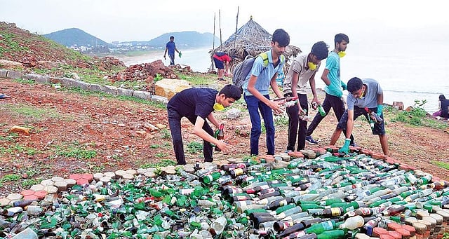 VISAKHAPATNAM: A group of youth collected a huge number of empty liquor bottles and plastic waste strewn along the Beach Road, mostly from inaccessible and less frequented areas, and tourism spots such as Kailasagiri and near city zoo.