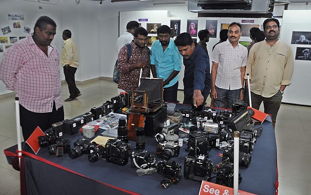 The New Indian Express lensman Prasant Madugula’s photo bagged second prize out of the 272 photos sent by 68 photographers across the country. Collection of old and new cameras (collected by well-known photographer Srinivas Reddy) was put on display. Nikon F3, Nikon D2X, Nikon F100, Nikon D200, Canon 1300D, Sony 380, Polaroid and Practika were some of the cameras put on display.