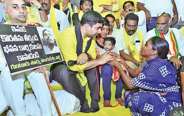 GUNTUR: TDP national general secretary Nara Lokesh has launched a broadside against the YSRC government over sand scarcity. He alleged that the price of sand, which was available for Rs 1,400 to Rs 1,800 per tractor load during the TDP rule, has shot up to Rs 4,000-Rs 6,000.