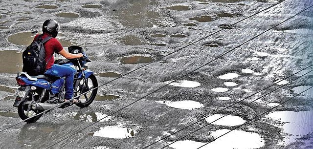A man rides on RC road, which was severely damaged by the rain in Tirupati on Wednesday | Madhav K