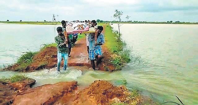 When Thamash got severe chest pain on Sunday morning, his relatives called 108 for an ambulance, but the vehicle couldn’t travel beyond Gotluru village as the roads were under water. They then carried him on a cot at least four kilometres, and took him on a tractor for about a kilometer to the ambulance. But by the time they reached, he was dead.