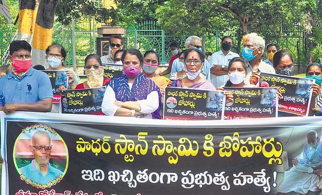 VISAKHAPATNAM: Rights organisations blamed the government for the death of Father Stan Swamy, who died on Monday in a private hospital where he was shifted in May after his health began deteriorating. Speaking at a demonstration at Gandhi statue near GVMC office, CPI State assistant secretary JV Satyanarayana Murthy and Human Rights Forum (HRF) representative VS Krishna said, bail norms of ‘Bail is rule, jail is an exception’ were not followed in the case of 84-year-old Fr Stan Swamy who had been suffering from Parkinson disease.