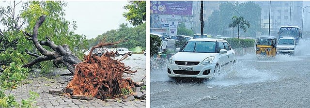 Heavy rains accompanied by gusty winds started battering Tirupati and its surrounding areas since Wednesday night. Almost the entire temple town was under knee-deep water throwing normal life out of gear. Several trees got uprooted and drains were clogged. The falling of trees on power lines disrupted electricity supply at several places.