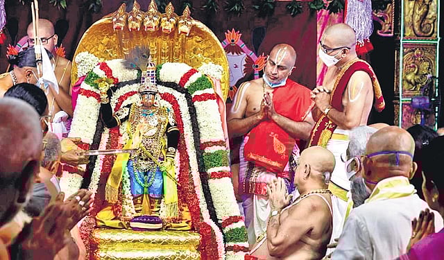 TIRUMALA: Chinna Sesha Vahana Seva was performed to the processional deity Lord Malayappa Swamy on Friday, October 8, 2021, the second day of the annual Srivari Brahmotsavams in Tirumala. As all rituals for Brahmotsavams are being performed in ‘ekantam’, due to the existing Covid protocol, the vahana seva was confined to the temple.