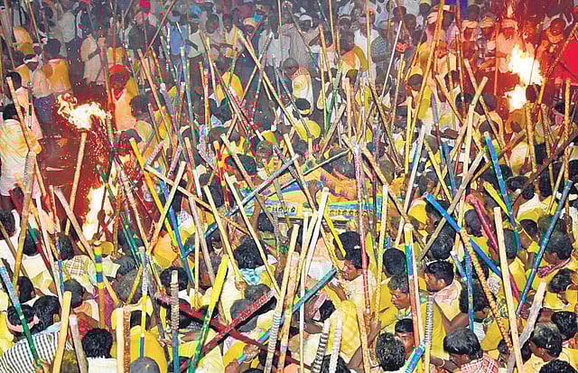Though the district administration had imposed restrictions on gathering of people last year, villagers gathered in good numbers defying the ban orders and took part in the fight. The traditional stick fight will be held on October 15 midnight as part of the nine-day Dasara festivities, which started on Monday.