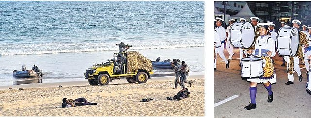 Rehearsals of operational display as part of MILAN being conducted at RK Beach in Visakhapatnam on Wednesday. (Photo | EPS)