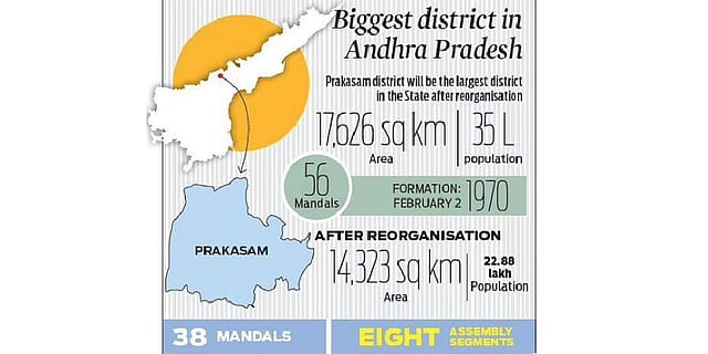 Even after losing a significant number of mandals in the reorganisation, Prakasam district will be the largest district in the State with an area of 14,323 sq km. It will have eight Assembly segments under Ongole Lok Sabha Parliamentary Constituency with a population of 22.88 lakh (2011 census). It will have 38 mandals instead of the present 56.