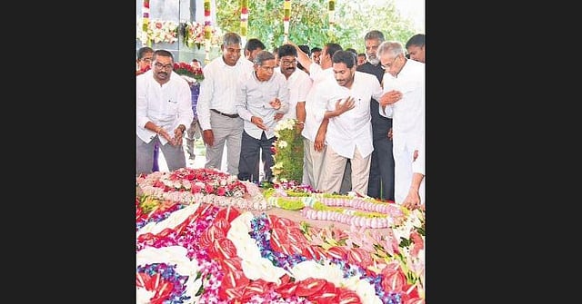 Chief Minister YS Jagan Mohan Reddy pays tributes to his father YS Rajasekhara Reddy at the YSR Ghat in Idupulapaya of Kadapa district on Friday I Express