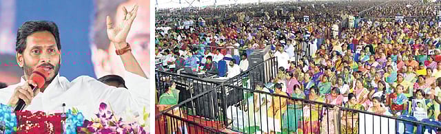 CM YS Jagan Mohan Reddy addressing a gathering during an event to disburse `4,949.44 crore financial aid to 26,39,703 women in Kuppam on Friday | Express