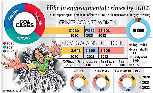 The NCRB also reported that there is an increase in economic offences in the State with more cases of forgery, cheating and fraud. Similarly, there is a rise in cybercrimes by 24 per cent with 2,341 cases in 2022, against 1,875 in 2021. “Lottery scams, fake job offers and OTP frauds continue to increase, despite taking measures,” said NTR district commissioner of police Kanthi Rana Tata. Also, the cases under environment protection law increased by 200 percent with 1,294 cases in previous year against 420 cases in 2021.
