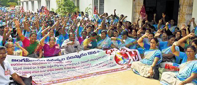 VIJAYAWADA: Anganwadi workers’ unions affiliated with CITU, AITUC and IFTU, initiated a strike on Tuesday, demanding the resolution of long-standing issues. The workers, demanding salary hikes and gratuity payments, staged mass protests at 257 project offices, leading to the closure of 55,600 Anganwadi centres Statewide.