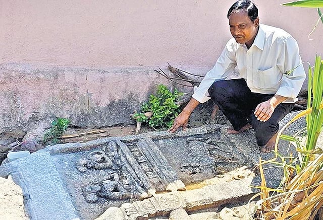 In the lower part, a sculpture is depicted as bidding farewell to the hero by his wife through Sati before departing. They sit on a dais with a pillar on their right. The inscription also depicts the hero standing, while on the other side, he is holding a horse, the historian said.MyNaa Swamy, who visited Kasturi Ranganatha temple in Vanavolu at the request of some villagers, was shocked to find the rare inscription lying next to a garbage dump, which was littered.