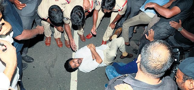 He got down from his vehicle and started to walk. After being pacified by the police, he got back into his vehicle but sat on its roof waiting for the outcome of discussions between police and JSP leader Nadendla Manohar. Later, police took Pawan and Manohar into custody.