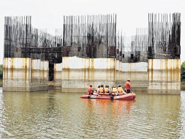 The inspection was carried out using a boat, supported by State Disaster Response Force (SDRF) personnel equipped with life jackets and other protective gear. One of the engineers noted that the structures were submerged in 0.75 TMC water, and iron rods were heavily rusted.