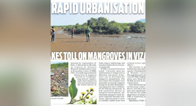 The article, titled “Rapid urbanisation takes toll on Mangroves in Vizag,” described how extensive mangrove ecosystems in the city have been reduced to scattered patches, threatened by ongoing development.
