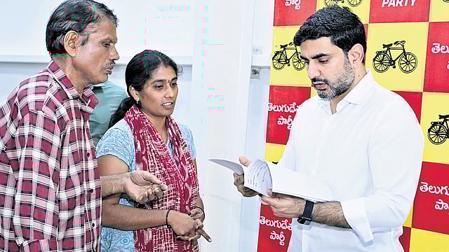 Representatives of AP Polytechnic Workshop Attendants Association sought revival of the stalled regularisation process covering 117 staff. The HRD Minister promised to look into their long-standing salary concerns. Villagers of Gattugudem in Eluru district urged the HRD Minister to reconstruct the Mandal Parishad Primary School building in the village as it was in a dilapidated condition. K Dasu from Prakasam district sought employment for his daughter, who lost her eyesight due to Covid-19 and dengue. Lokesh promised suitable job placement for her.